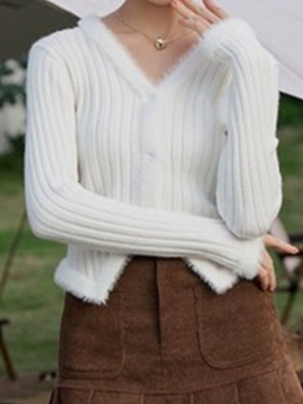 Solid V Neck Fuzzy Trim Slim Ribbed Knit Cardigan