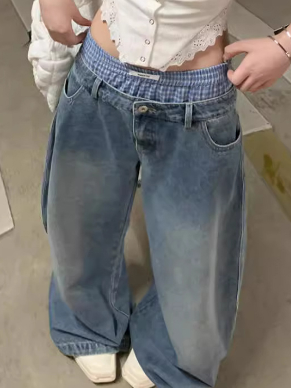 Designed Double Waistband Washed Wide Legs Boyfriend Jeans