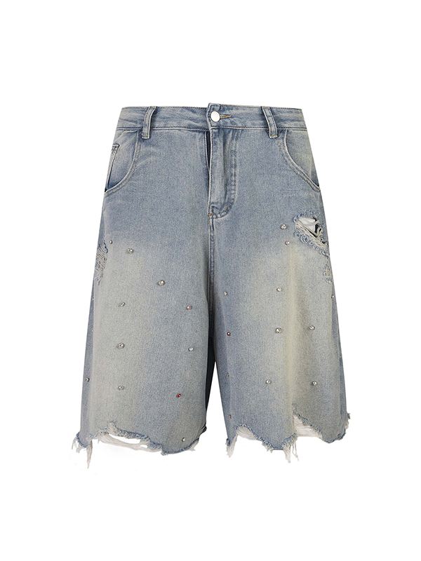 Men’S Washed Distressed Rhinestones Ripped Denim Shorts