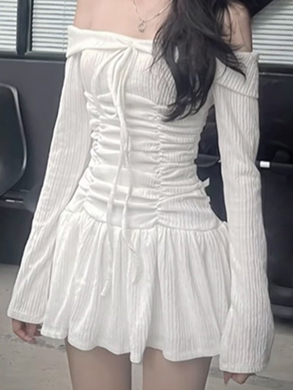 Off Shoulder Corset Splice Flare Sleeve Mini Dress
