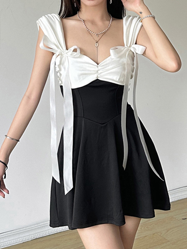 Black White Contrasting Square Collar Bust Pleats Mini Dresses
