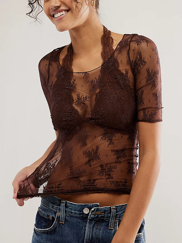 See Through Lace Crew Neck Short Sleeve Tee