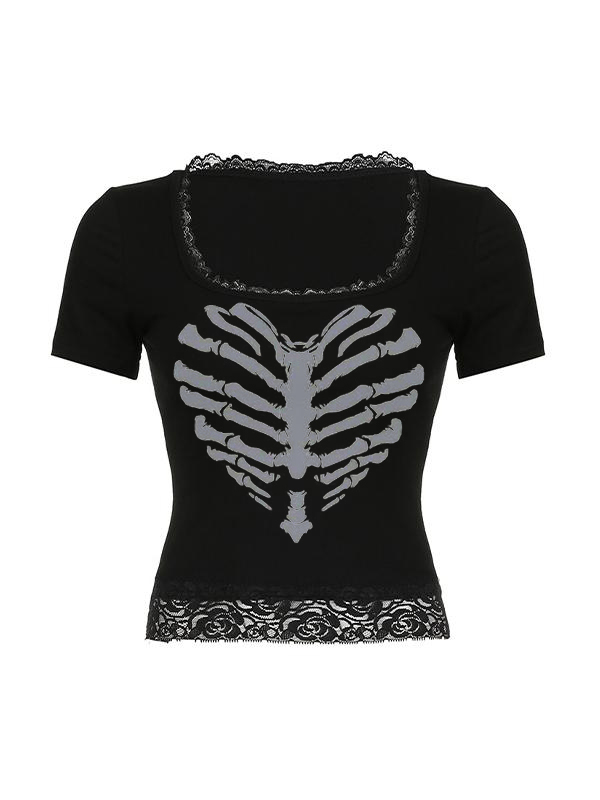 Lace Patchwork Skull Print Black Short Sleeve Tees