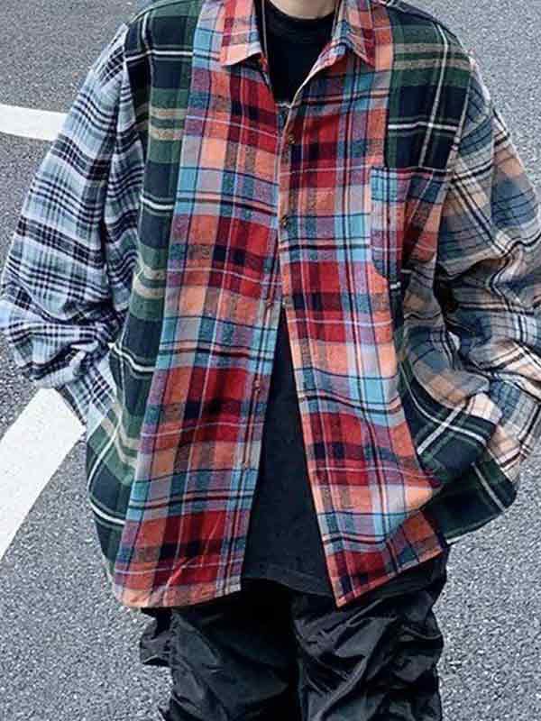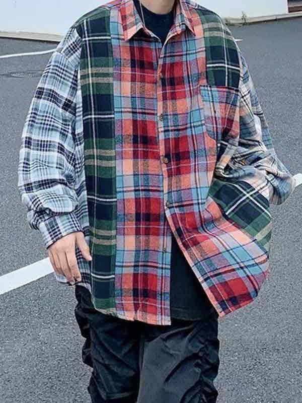 Men’s Vintage Plaid Splice Long Sleeve Blouse