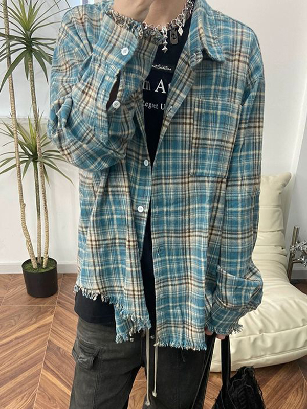 Men’s Vintage Distressed Plaid Long Sleeve Blouse