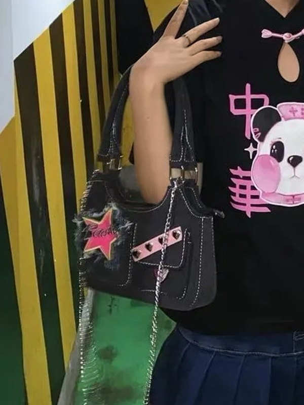 Details: These shoulder bags for girls included a long chain shoulder strapStyle, features distressed fray star& letter embroidered on it, paneled with pockets design on the front, it has contrast stitched detail, and with heart charm embellished.