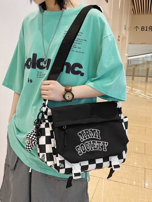 Buckle Strap Checkered Nylon Crossbody Bag